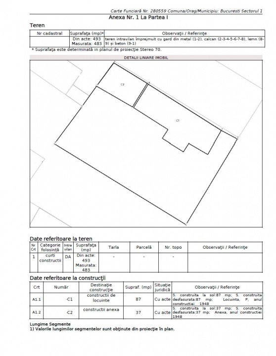 Vă propunem spre vânzare un teren intravilan de 483 mp, situat pe Strada Galiceni nr. 24, în cartierul Bucureștii Noi, una dintre cele mai echilibrate și căutate zone rezidențiale din Sectorul 1. Proprietatea este împrejmuită și include o casă construită în anul 1948, din cărămidă, plus o anexă, ambele înscrise în cartea funciară.